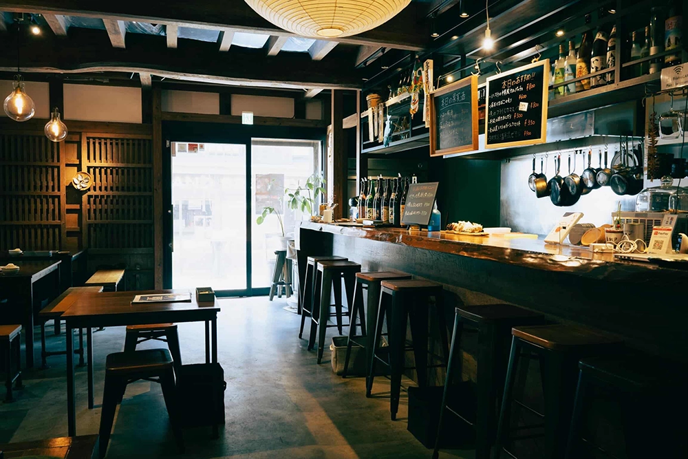 壱岐の魚や壱岐牛など地物を使った創作料理を楽しめる、築120年の酒蔵をリノベーションしたレストラン。